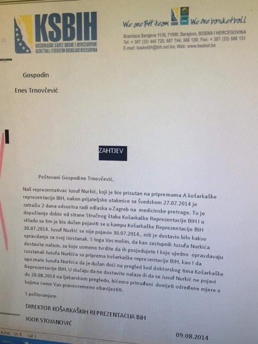 U svom je dopisu Stojanović prijetio da će “preduzeti određene mjere” ako do 20. avgusta 2014. ne dođem na ljekarski pregled ili ne pošaljem nalaz koji opravdava moje odsustvo. Želio sam doći na pregled, ali kako su trojica jarana, koji su tada vodili naš košarkaški savez, već podigli hajku na mene, procijenio sam da je najbolje da pošaljem nalaz.
