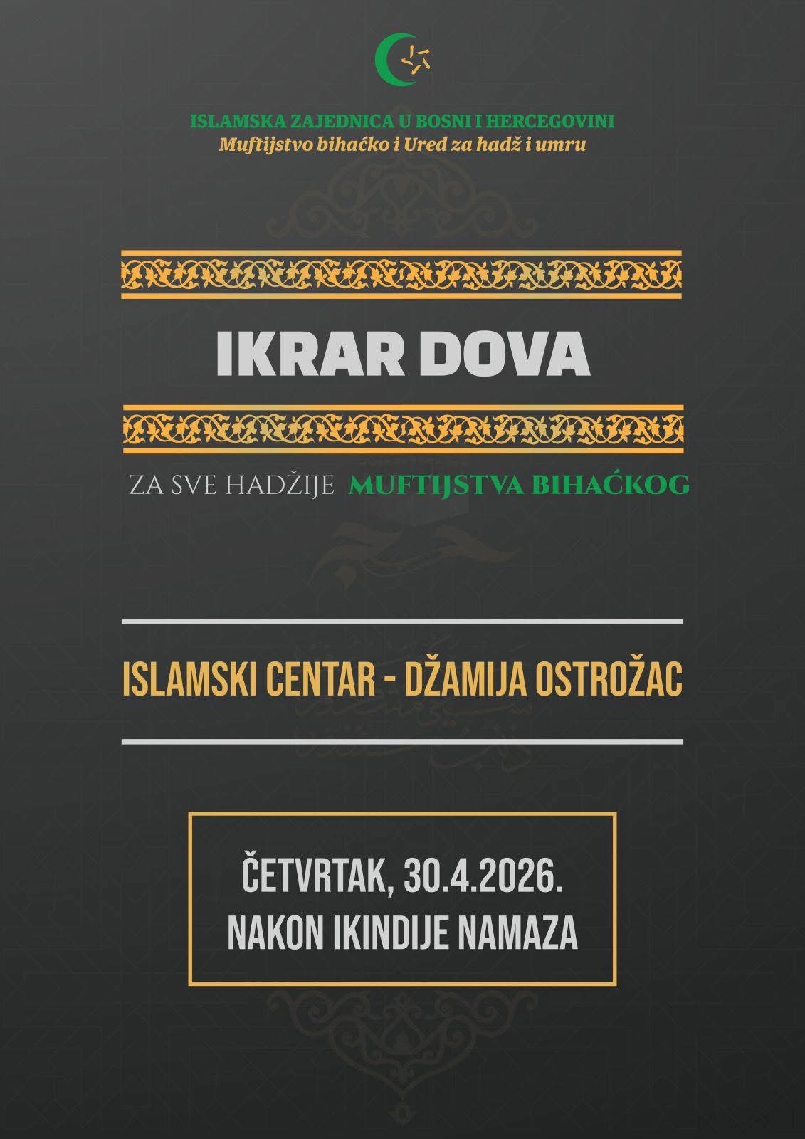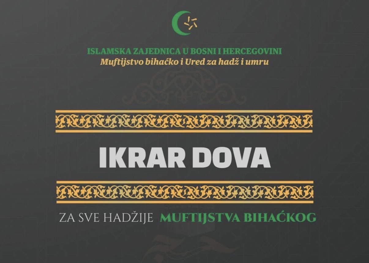 U Islamskom centru – džamiji Ostrožac u Cazinu u četvrtak, 30. aprila 2026. godine, bit će upriličena ikrar dova i svečani ispraćaj ovogodišnjih hadžija s područja Muftijstva bihaćkog.