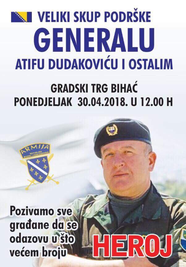 U ponedjeljak 30. aprila s početkom u 12 sati, u Bihaću će se održati veliki skup podrške generalu Atifu Dudakoviću i uhapšenim pripadnicima Petog korpusa.