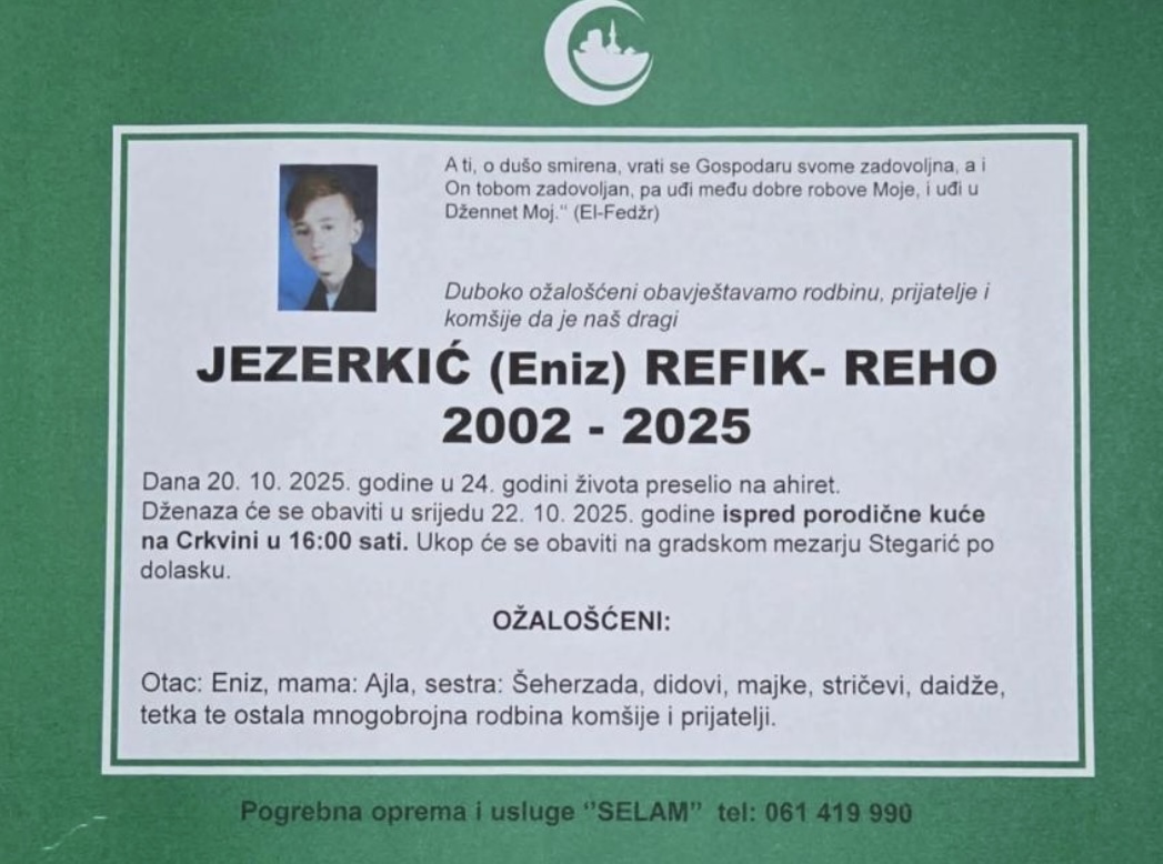 Krajina i Bosanska Otoka žale za još jednim mladim životom koji je prerano ugašen. Nakon kratke bolesti, u 24. godini života, preselio je na ahiret Refik (Eniz) Jezerkić – Reho, mladić kojeg su svi poznavali kao vedrog, pristojnog i ponosnog momka.