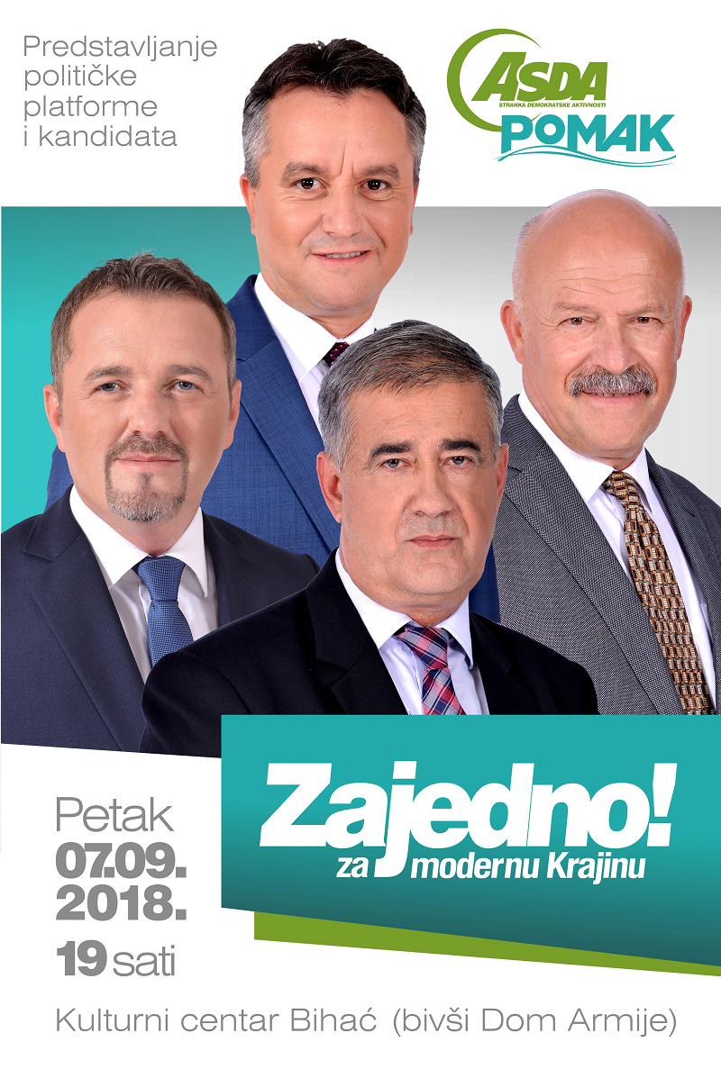 Stoga vas pozivamo da nam se pridružite na našem prvom predizbornom predstavljanju u Bihaću 7. septembra 2018. godine od 19 sati u sali Kulturnog centra (bivši Dom Armije BiH).