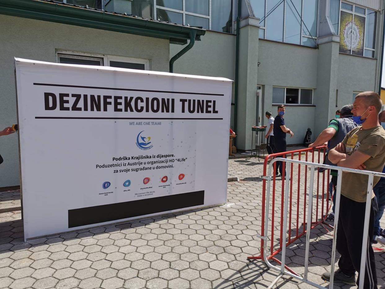 Danas je ispred karantena "Medresa" u Cazinu, u kojem boravi preko 70 građana Unsko- sanskog kantona koji su doputovali iz inostranstva, postavljen tunel za dezinfekciju koji su donirali članovi Humanitarne organizacije For Life iz austrijskog Linza.