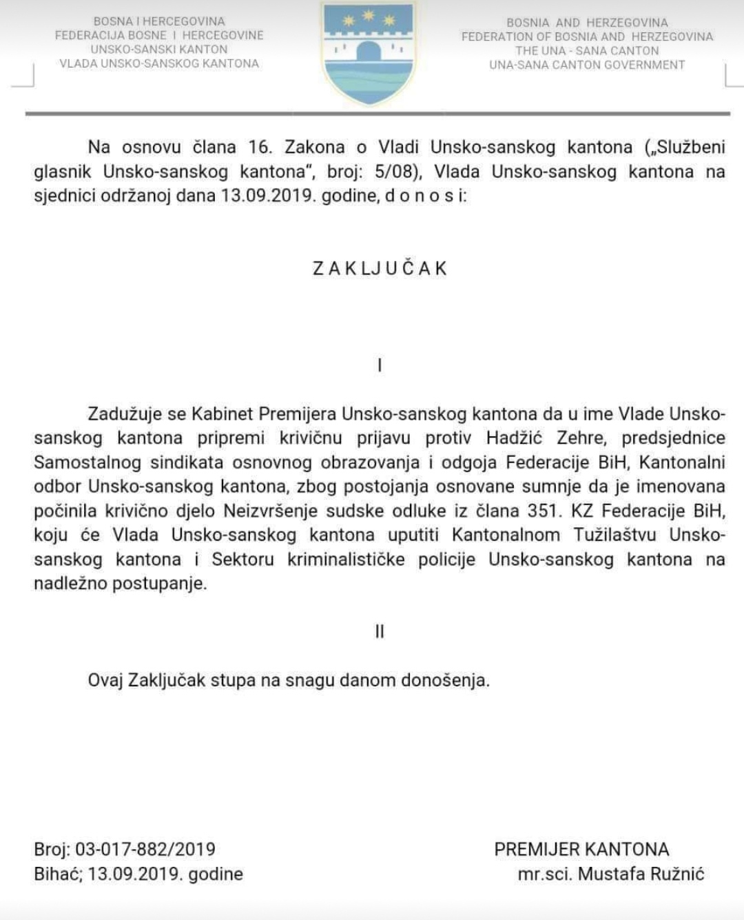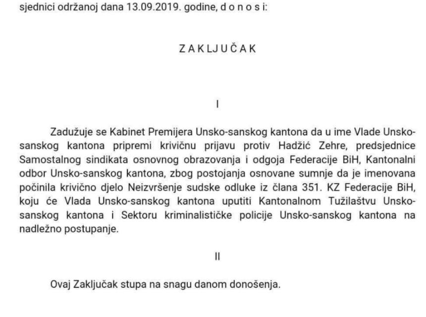 Na današnjoj sjednici Vlade USK-a na kojoj se isključivo pričalo o štrajku prosvjetnih radnika, doneseni su slijedeći zaključci: nastava počinje 16. septembra, protiv predsjednice Sindikata osnovnog obrazovanja i odgoja USK Zehre Hadžić biće podnijeta krivična prijava, Vlada USK-a je zatražila od Porezne uprave FBiH da ispita zakonitost poslovanja oba sindikata.