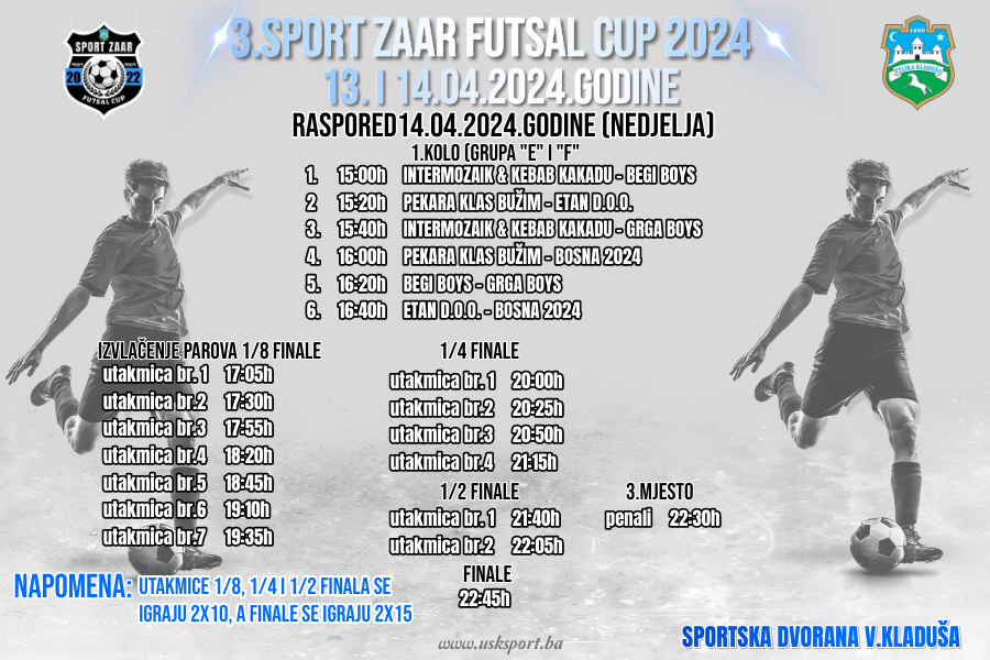 3. SPORT ZAAR FUTSAL CUP 2024 nastavlja se danas utakmicama u grupama E i F, nakon čega je na programu završnica turnira. Turnir se igra u Gradskoj sportskoj dvorani, a današnji sportski program počinje od 15:00h.