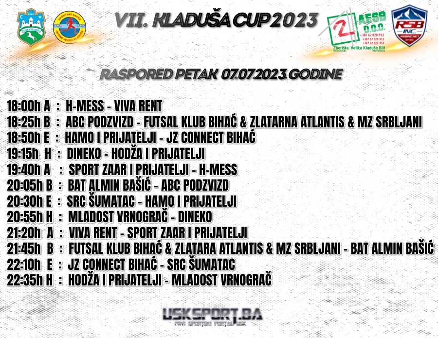 Danas počinje VII Kladuša Cup 2023. Učešće će uzeti ukupno 24 ekipe, raspoređene u osam grupa. Žrijeb za ovaj turnir održan je jučer, a ovo su današnji parovi: