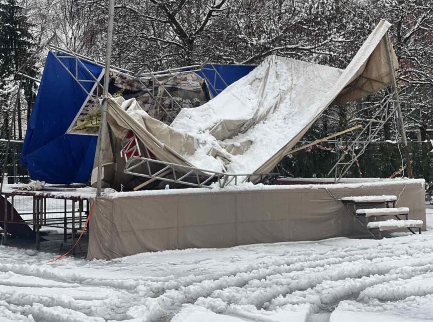 Usljed sniježnih nanosa koje su protekle noći zadesile općinu Sanski Most, šteta je pričinjena i na bini koja je postavljena za potrebe Zimske čarolije, gdje je pod težinom snijega došlo do urušavanja i pada krovne konstrukcije.