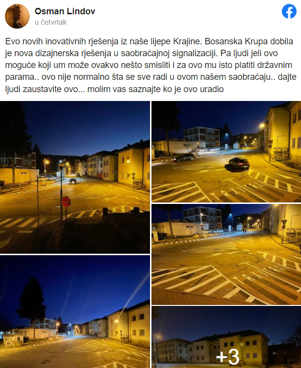 Evo novih inovativnih rješenja iz naše lijepe Krajine. Bosanska Krupa dobila je nova dizajnerska rješenja u saobraćajnoj signalizaciji. Pa ljudi, jeli ovo moguće, koji um može ovakvo nešto smisliti i za ovo mu isto platiti državnim parama. Ovo nije normalno šta se sve radi u ovom našem saobraćaju. Dajte ljudi zaustavite ovo. Molim vas saznajte ko je ovo uradio - napisao je Lindov na Facebooku.