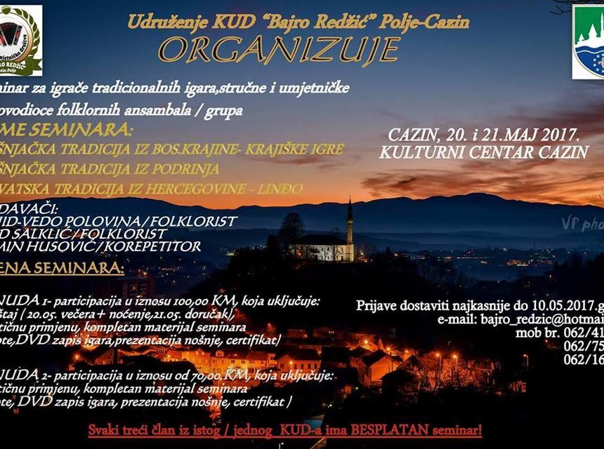 KUD "Bajro Redžić" Polje-Cazin ove godine organizira Seminar za igrače tradicionalnih igara, stručne i umjetničke rukovodioce folklornih ansambala/grupa pod nazivom "Čuvajmo stare običaje i tradiciju".