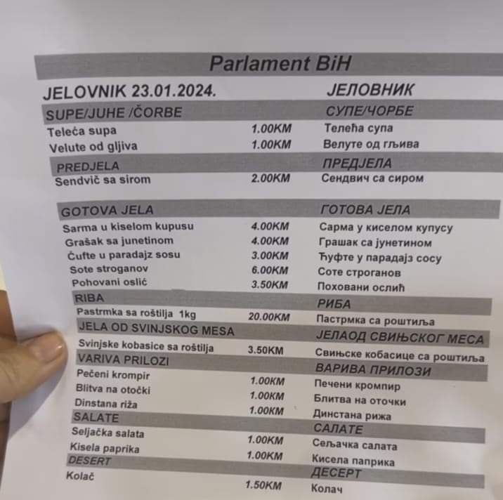 Upravo prije tri dana objavljen je cjenovnik restorana u Parlamentarnoj skupštini BiH, gdje se vidi da supe koštaju 1 KM, kao i razne salate, ali i prilozi, poput krompira, blitve i riže.
