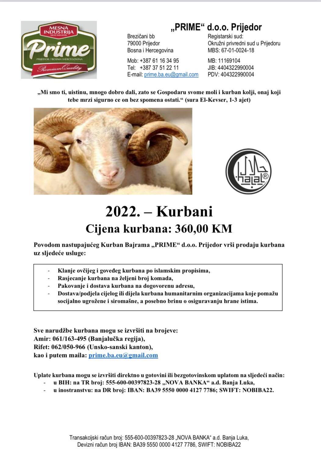KRAJINA 13 Jun, 2022 - 15:49 / Uredio: Sandi / 0 Comments Kurbani 2022- cijena 360 KM Povodom nastupajućeg Kurban Bajrama Prime d.o.o. iz Prijedora osigurava kupovinu kurbana. Pročitajte detalje o uvjetima koje donosimo u slici ispod. Također, ispod su i kontakti osoba s kojima možete dalje dogovoriti sve pojedinosti. kurbani Related Articles CAZIN KRAJINA 04 Dec, 2025 Saobraćajna nesreća u Cazinu: ‘Vozač udario više vozila u pokretu i pobjegao’ KRAJINA 04 Dec, 2025 Vlada USK usvojila ključne odluke: Više sredstava za privredu, socijalu i obrazovanje KRAJINA 04 Dec, 2025 Sutra (petak) bez struje širom Krajine – Provjerite da li ste na spisku KRAJINA 04 Dec, 2025 Krajina: Nakon brutalne tuče 61-godišnjak se bori za život - evo detalja KRAJINA 04 Dec, 2025 Krajina konačno dobija brzu cestu: Počinje historijski projekat u Bihaću, Cazinu i Velikoj Kladuši Bihać KRAJINA 04 Dec, 2025 Počela izgradnja gradskog bazena u Bihaću, vrijednost investicije osam miliona KM