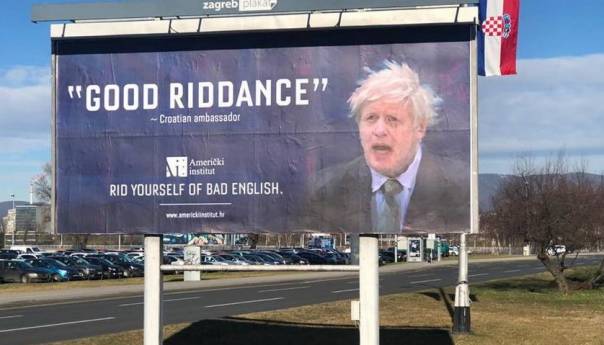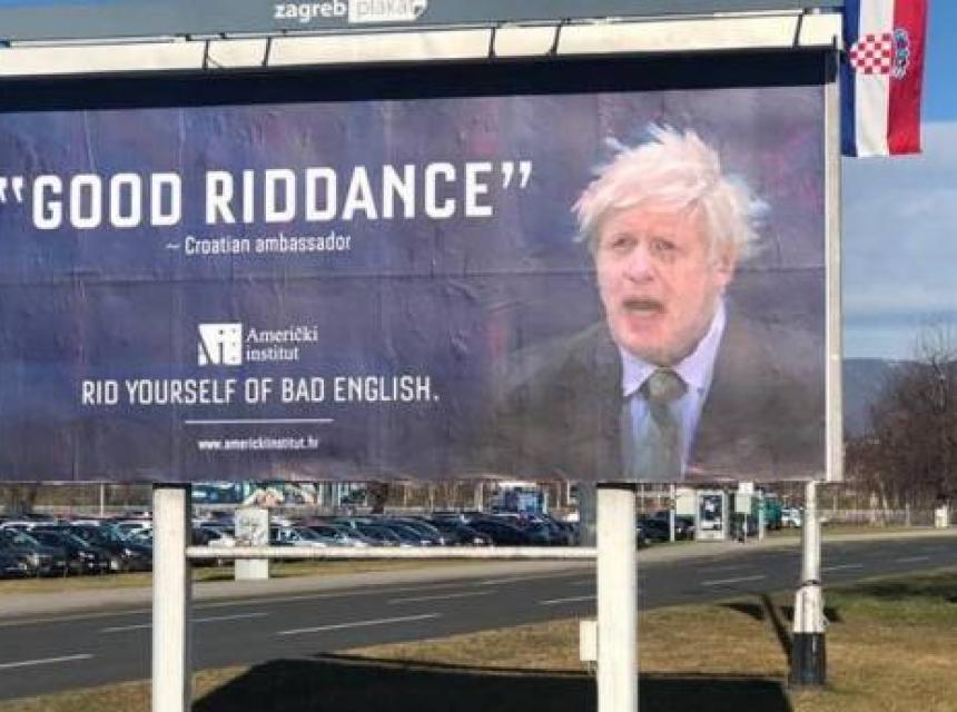 Na plakatu piše "Good riddance", uz potpis "hrvatska ambasadorica", a ispod toga je logo i poruka Američkog instituta: "Rid yourself of bad english", što u prevodu znači: "Riješite se lošeg engleskog".