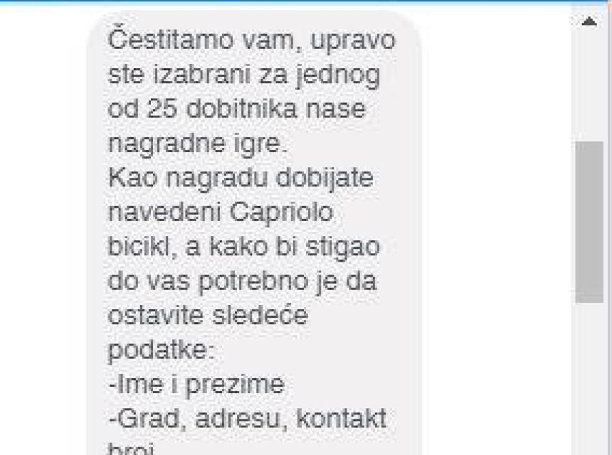 Nagradna igra sastoji se u tome da je na lažnoj Facebook stranici 20. 9. 2019. godine objavljena nagradna igra u kojoj "Capriolo" poklanja 25 "Capriolo" bicikala, te je za učestvovanje potrebno lajkovati stranicu, podijeliti objavu na vlastitom profilu i u inboksu navesti broj od 1 do 500 - prenosi N1.