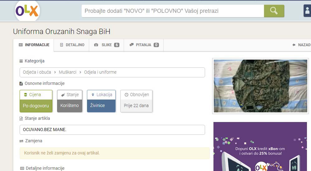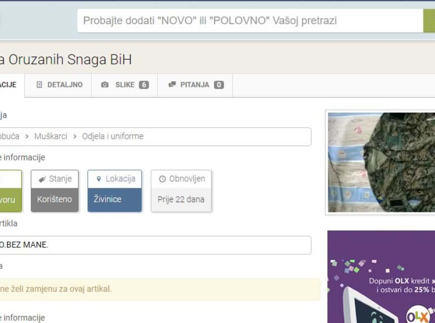 Tako jedan ponuđač iz Živinica navodi da prodaje uniformu Oružanih snaga BiH, a u svom oglasu je čak i objavio zvanični video spot OS BiH.