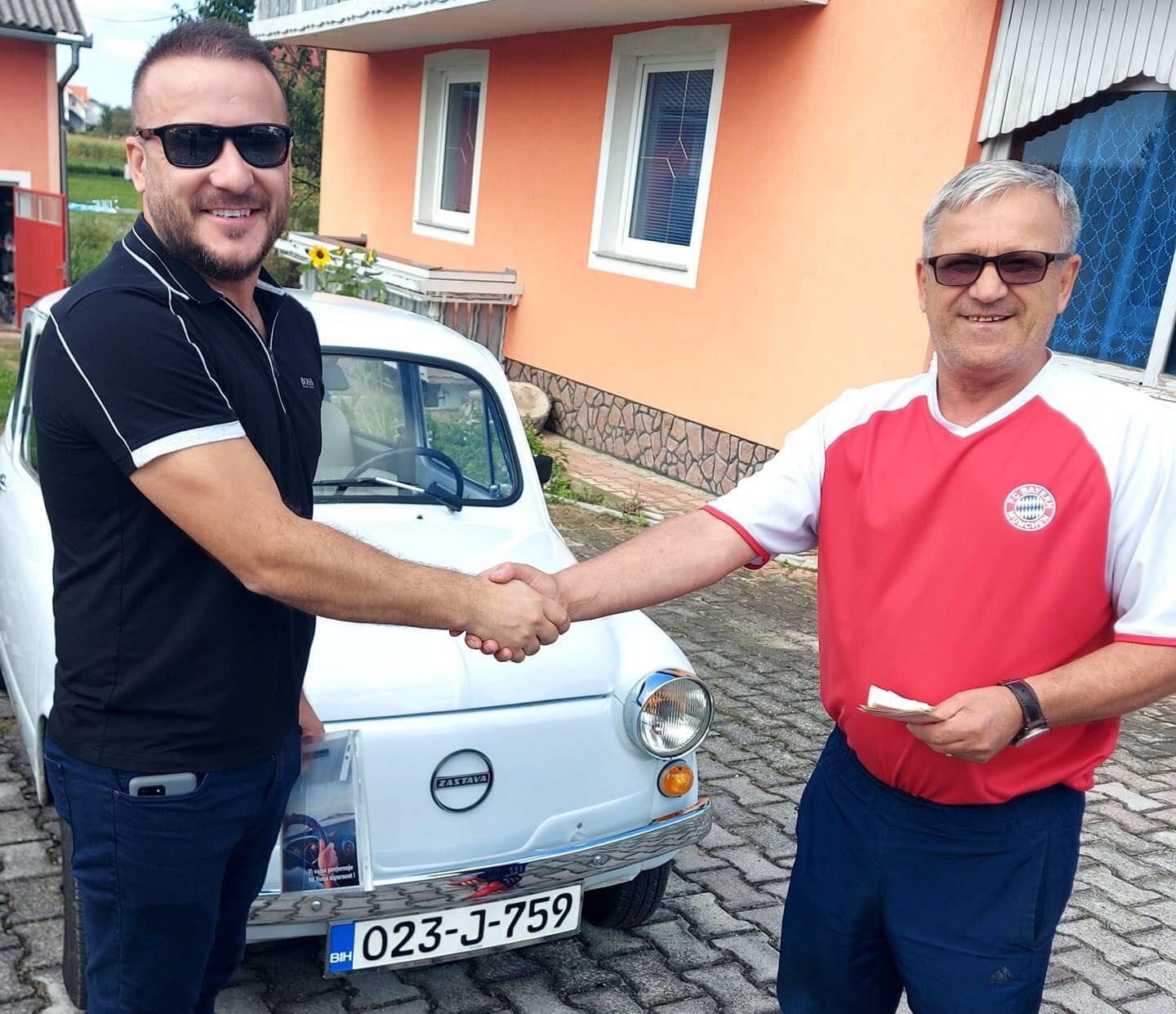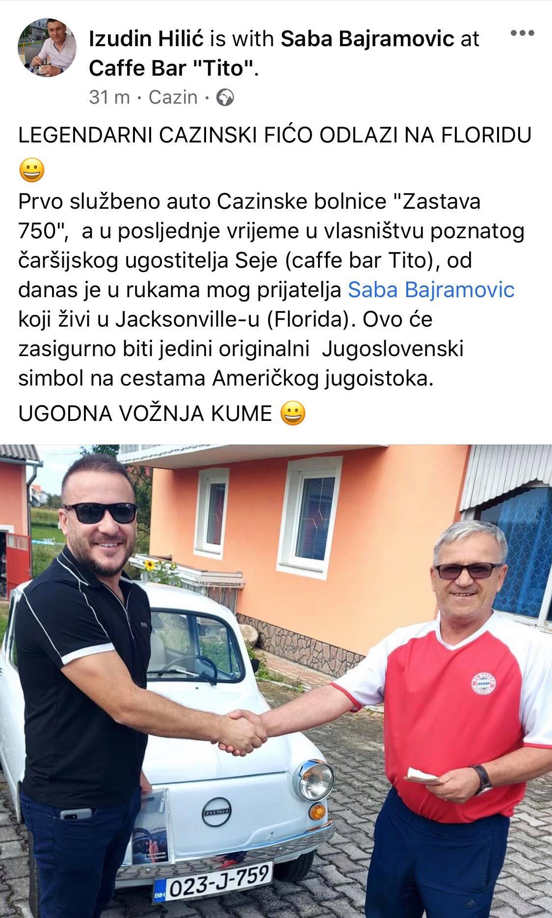 “Prvo službeno auto Cazinske bolnice "Zastava 750", a u posljednje vrijeme u vlasništvu poznatog čaršijskog ugostitelja Seje (caffe bar Tito), od danas je u rukama mog prijatelja Saba Bajramovic koji živi u Jacksonville-u (Florida).