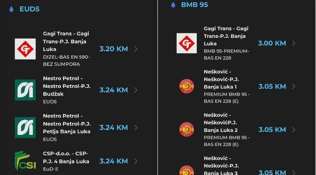 Istovremeno, u Republici Srpskoj slične cijene. Cijena litra benzina u Banjoj Luci se kreću od 3 KM do 3,47 KM, dok se cijena dizela kreće od 3,20 do 3,54 KM.