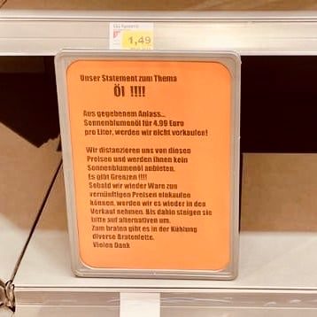 “Nismo očekivali kako će se situacija razviti u smjeru u kojem se razvila. Na policu s uljem smo postavili natpis s objašnjenjem zašto više ne prodajemo ulje. Nećemo prodavati suncokretovo ulje za 4,99 eura po litri. Ograđujemo se od ovih cijena. Postoje granice”, rekla je voditeljica trgovine Anja Müller za njemački RTL te dodaje kako su kupci dobro reagirali na njihov potez.