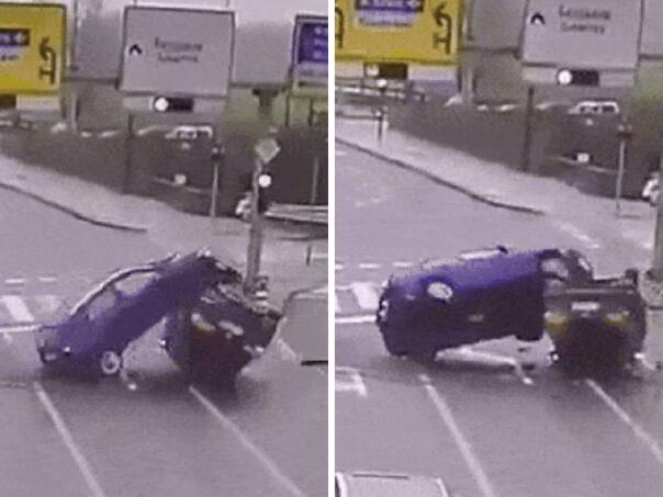 Kamera je zabilježila trenutak kada automobil velikom brzinom prelazi preko trotoara i udara u vozilo koje je čekalo na semaforu. Od siline sudara oba automobila završila su prevrnuta na krovu.