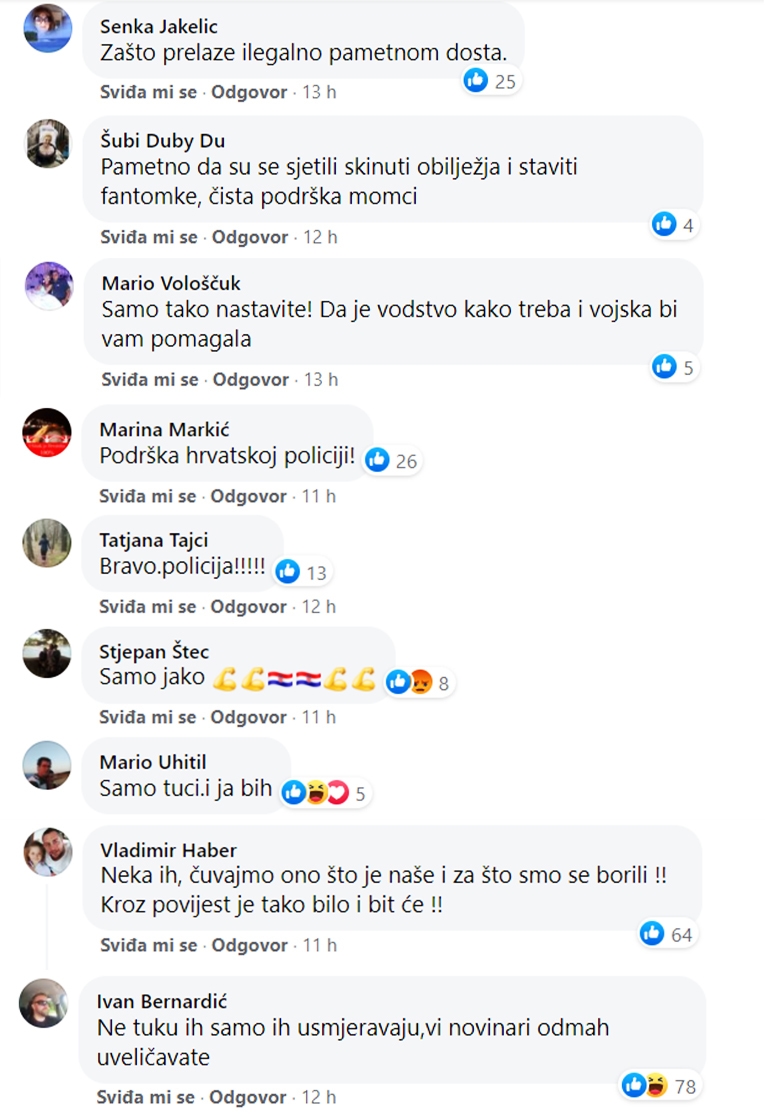 "Bravo, policijo!" napisali su na Facebooku brojni građani, s time da ima i onih koji smatraju da na snimci nisu policajci te da je sve namješteno. S mlaćenjem migranata i ilegalnim pushbackom u BiH nitko od njih nema problema.