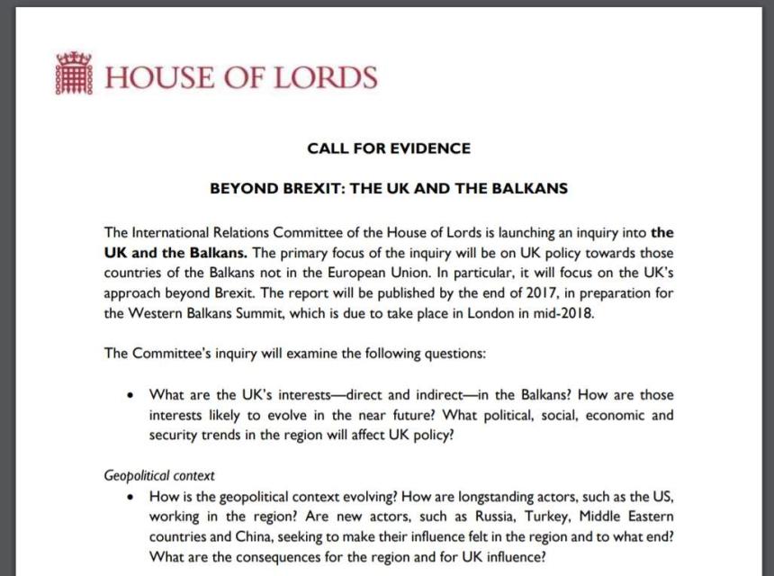 Komitet za vanjske poslove britanskog Doma lordova je pozvao sve relevantne fakore, istraživače, organizacije i pojedince da podnesu mišljenja i prijedloge u vezi sa budućim angažmanom Londona u našoj regiji, uključujući i Bosnu i Hercegovinu.