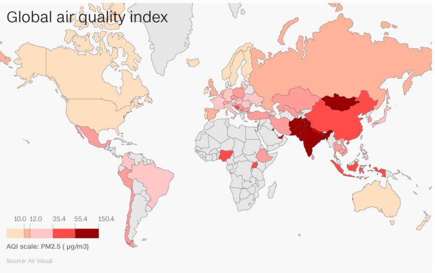 Među prvih 30 gradova na listi, 22 su indijski gradovi. Uprkos činjenici da su zemlje jugoistočne Azije najgore pogođene ovim fenomenom, AirVisual navodi da je je zagađenje globalni problem.