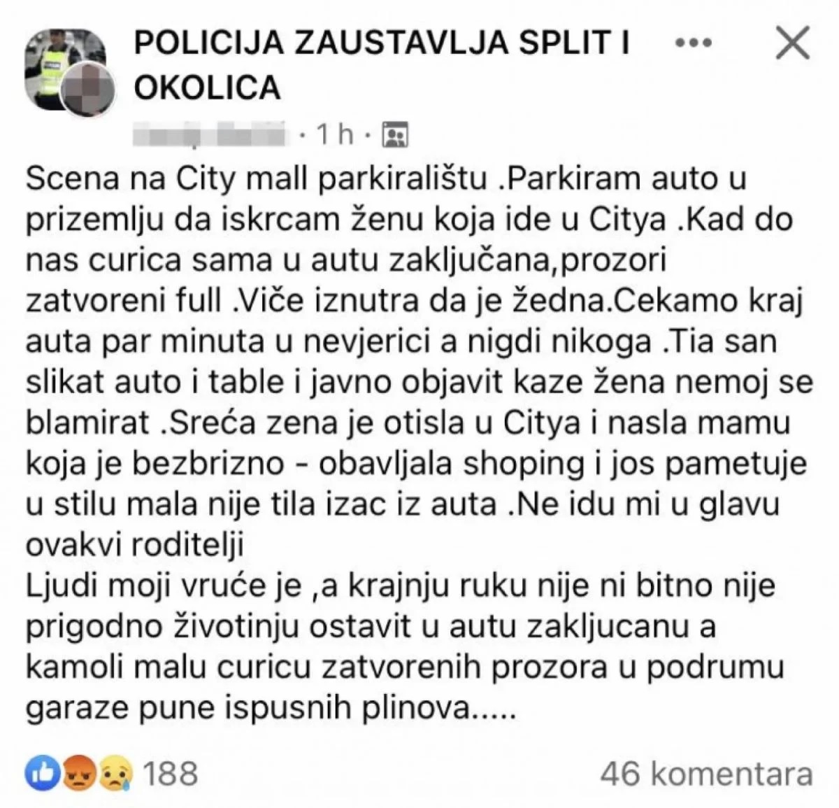 “Ne idu mi u glavu ovakvi roditelji. Nije prigodno životinju ostavit u autu zaključanu, a kamoli malu curicu zatvorenih prozora u podrumu garaže pune ispušnih plinova”, zapisao je taj očevidac u Facebook grupi pod imenom Policija zaustavlja Split i okolica.