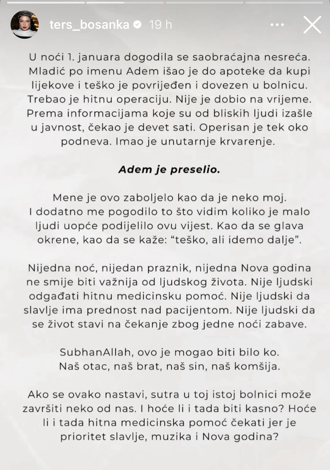 Poznata bh. make-up artistica i influenserica Ters Bosanka oglasila se na društvenim mrežama povodom tragične smrti mladića Adema, koji je preminuo nakon saobraćajne nesreće u noći 1. januara.