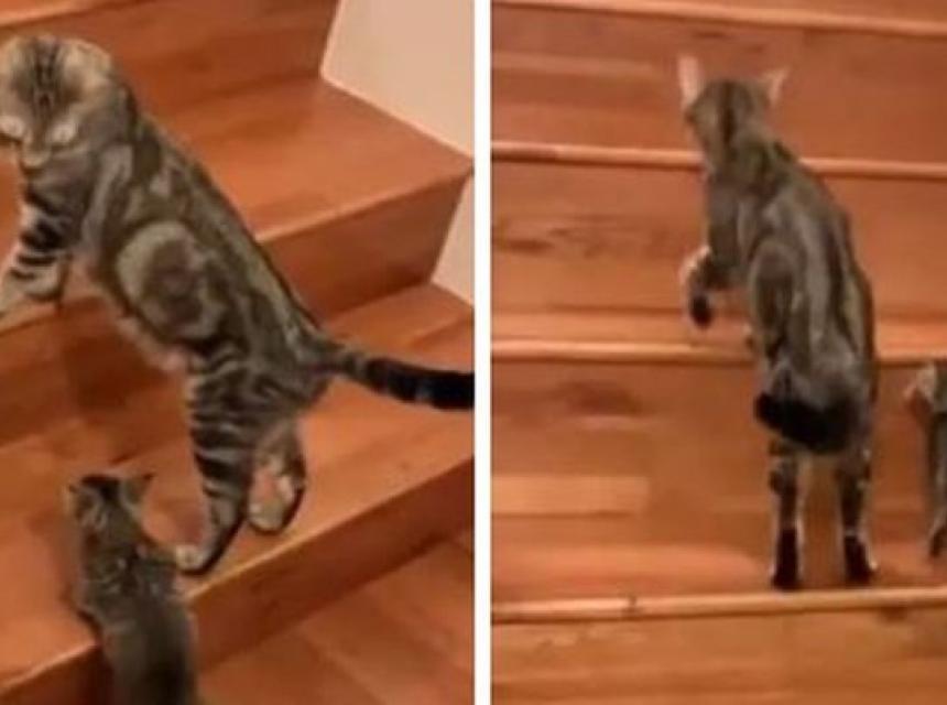 Činilo se kao da se mačić uplašio stepenica, ali njegova mama je bila tu da ga ohrabri i pomogne mu suočiti se sa strahom.