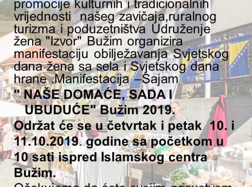 Ove godine manifestacija će se održati u četvrtak i petak, 10. i 11. oktobra ispred Islamskog centra u Bužimu. Organizatori su pozvali sve zainteresirane da se pridruže i zajedno provedu ove dane. Manifestacija nosi naziv: Naše domaće, sada i ubuduće, a namjera je promovirati očuvanje tradicije, kulture i običaja naših krajeva.