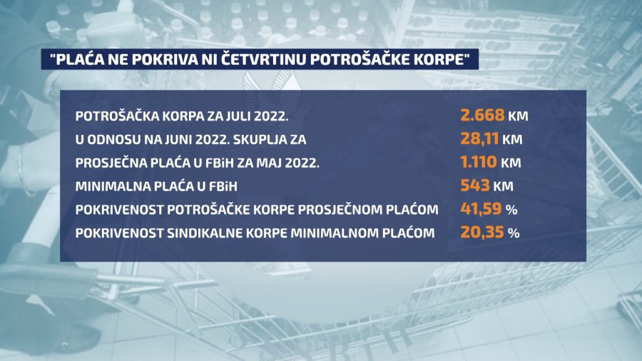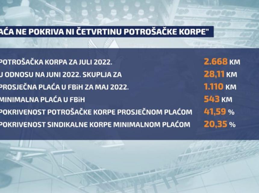Potrošačka korpa za mjesec juli u Federaciji BiH iznosi čak 2.668 maraka, što znači da prosječna plaća od oko 1.100 maraka može pokiriti polovinu korpe, a minimalna plaća 543 marke, tek 20 posto osnovnih životnih potrepština, podaci su Saveza samostalnih sindikata. Potrošačka korpa podrazumijeva prehranu, komunalne usluge, higijenu, obrazovanje, odjeću i obuću, prijevoz, a stvarne potrebe građana su i mnogo veće od toga, krediti, lijekovi, upozoravaju iz Sindikata.