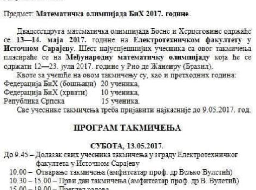 Društvo matematičara Republike Srpske uputilo je sredinom ove sedmice poziv mladim matematičarima za učešće na Matematičkoj olimpijadi Bosne i Hercegovine, koja se od 13. do 14. maja održava u Istočnom Sarajevu.