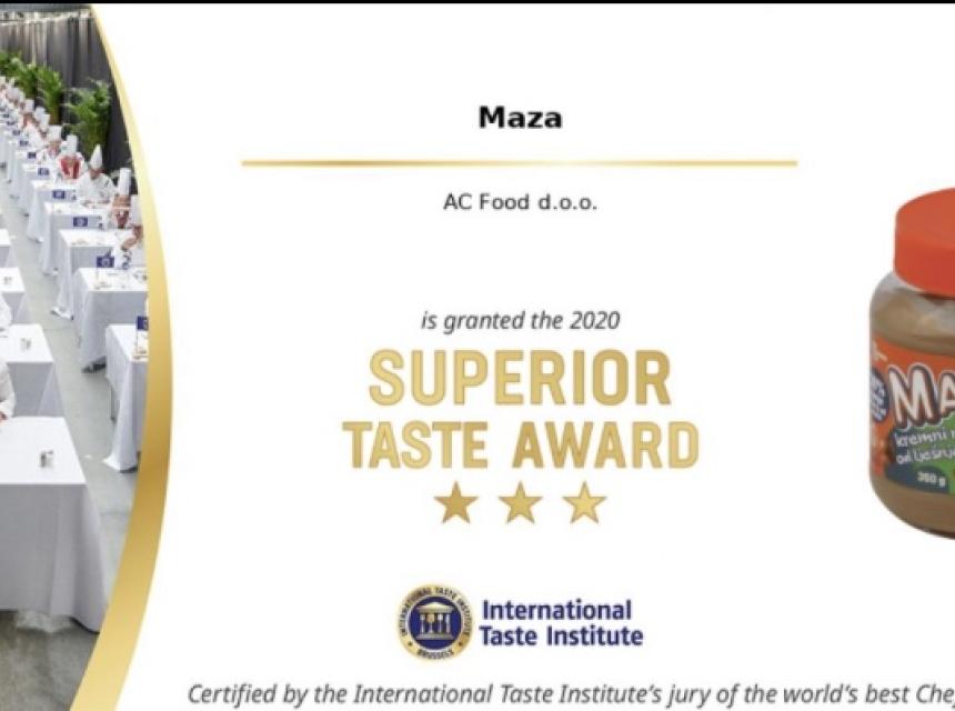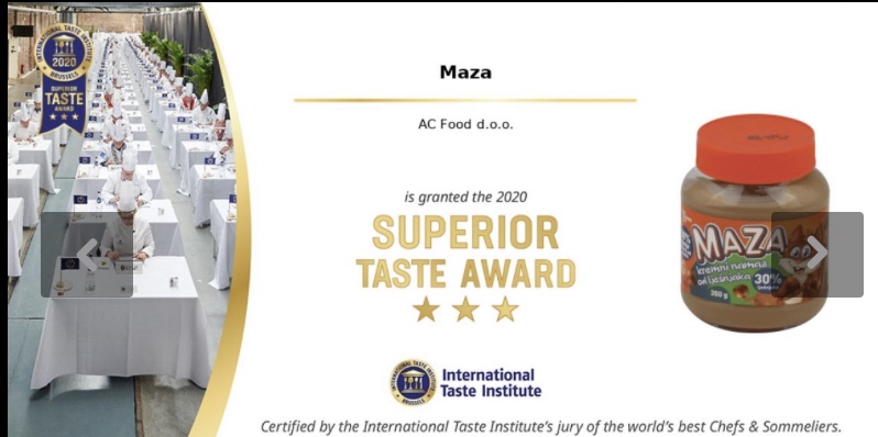 Žiri sastavljen od najprofesionalnijih stručnjaka za okuse proizvoda, ovaj mjesec u Briselu testirali su i certificirali 1510 proizvoda iz različitih kategorija iz svih država svijeta. Među testiranim proizvodima našao se i najtraženiji bh. proizvod - lješnjak namaz Maza. Na osnovu rezultata analize Međunarodnog instituta za okus Maza je, u kategoriji slatkih namaza, osvojila nagradu Superior Taste s 3 zvijezde.
