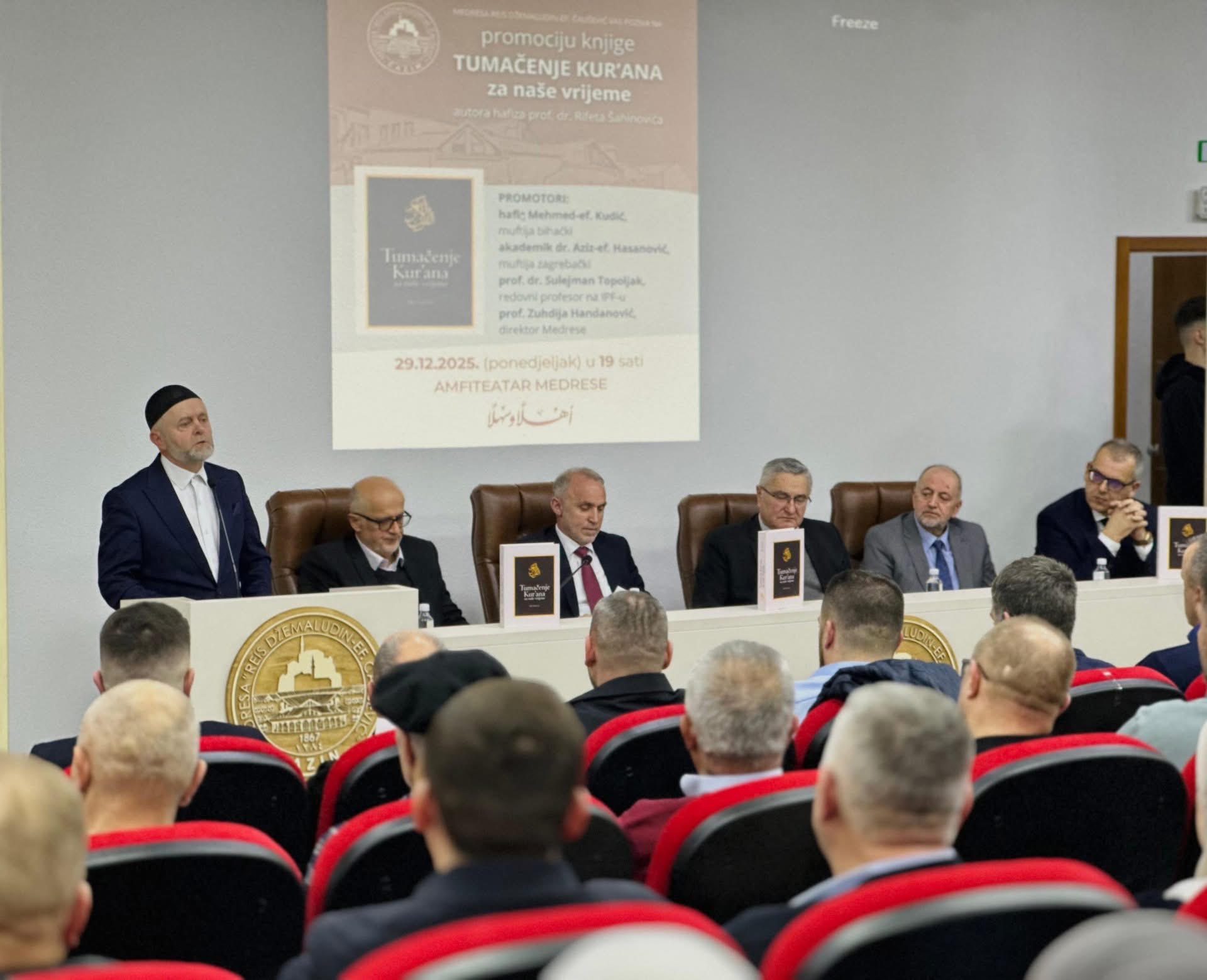 U amfiteatru Medrese, u ponedjeljak 29. decembra 2025. godine, održana je svečana promocija knjige „Tumačenje Kur’ana za naše vrijeme“ autora hafiza prof. dr. Rifeta Šahinovića. Izuzetno veliki interes publike još jednom je potvrdio značaj ovog djela, ali i ugled autora u akademskim, vjerskim i društvenim krugovima – amfiteatar je bio premalen da primi sve zainteresirane, a promociji je prisustvovalo više od 250 posjetilaca.