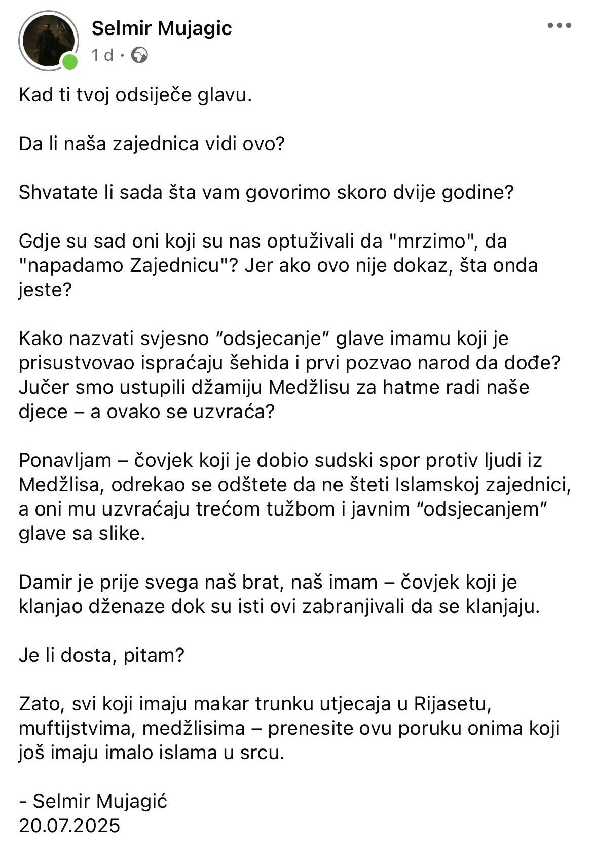 Imam Redžić je na društvenim mrežama jasno izrazio revolt, naglašavajući da ovakvi postupci razgolićuju pravo lice onih koji vode Medžlis i pokazuju duboki nedostatak morala i islamskih principa.