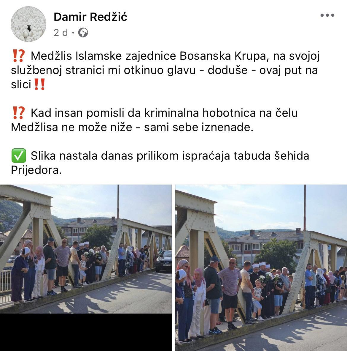 Bosanska Krupa je jutros osvanula s gorčinom u grlu. Na zvaničnoj stranici Medžlisa Islamske zajednice Bosanska Krupa objavljena je fotografija lokalnog imama Damira Redžića bez glave. Doslovno. Fotografija koja simbolično “odsijeca” imamu glavu nije slučajna greška, niti tehnički propust. To je čin. Sramotan, hladan i svjestan čin.