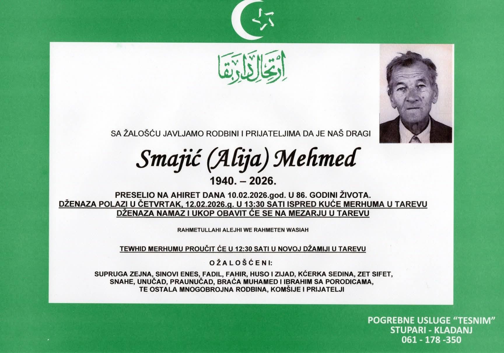 Tarevo je jučer zavijeno u tišinu i bol kada je stigla vijest da je Mehmed preselio na Ahiret. Na smrtovnici je, među ožalošćenima, stajalo i ime njegove supruge Zejne, vjerne saputnice s kojom je proveo decenije.