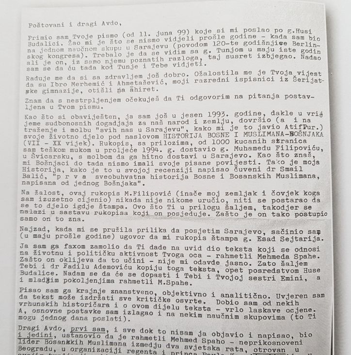 "Prema kazivanju izvršioca toga čina (da ne upotrijebim drugu riječ) Tvoj i Eminin otac – rahmetli Mehmed Spaho – je zaista otrovan u Hotelu 'Srpski kralj' u Beogradu, u njegovom apartmanu, koji je bio na III spratu, u Beogradu, krajem juna 1939. godine. On je dva puta spomenuo i koja je bila vrsta otrova, te da je smrt trenutno nastupila. I prema njemu, zavjeru i organizaciju izvršenja je izvršio princ Pavle. On mi je o tome govorio potanko. Nakon susreta, napravo sam zabilješku i ostavio u lični arhiv. Ovog puta ne želim da vam detaljno pišem. Za sve vas je najvažnije da se konačno potvrdilo ono u šta se sumnjalo i nije tačno znalo", navodi u pismu autor poznatog djela Historija Bosne i Bošnjaka.