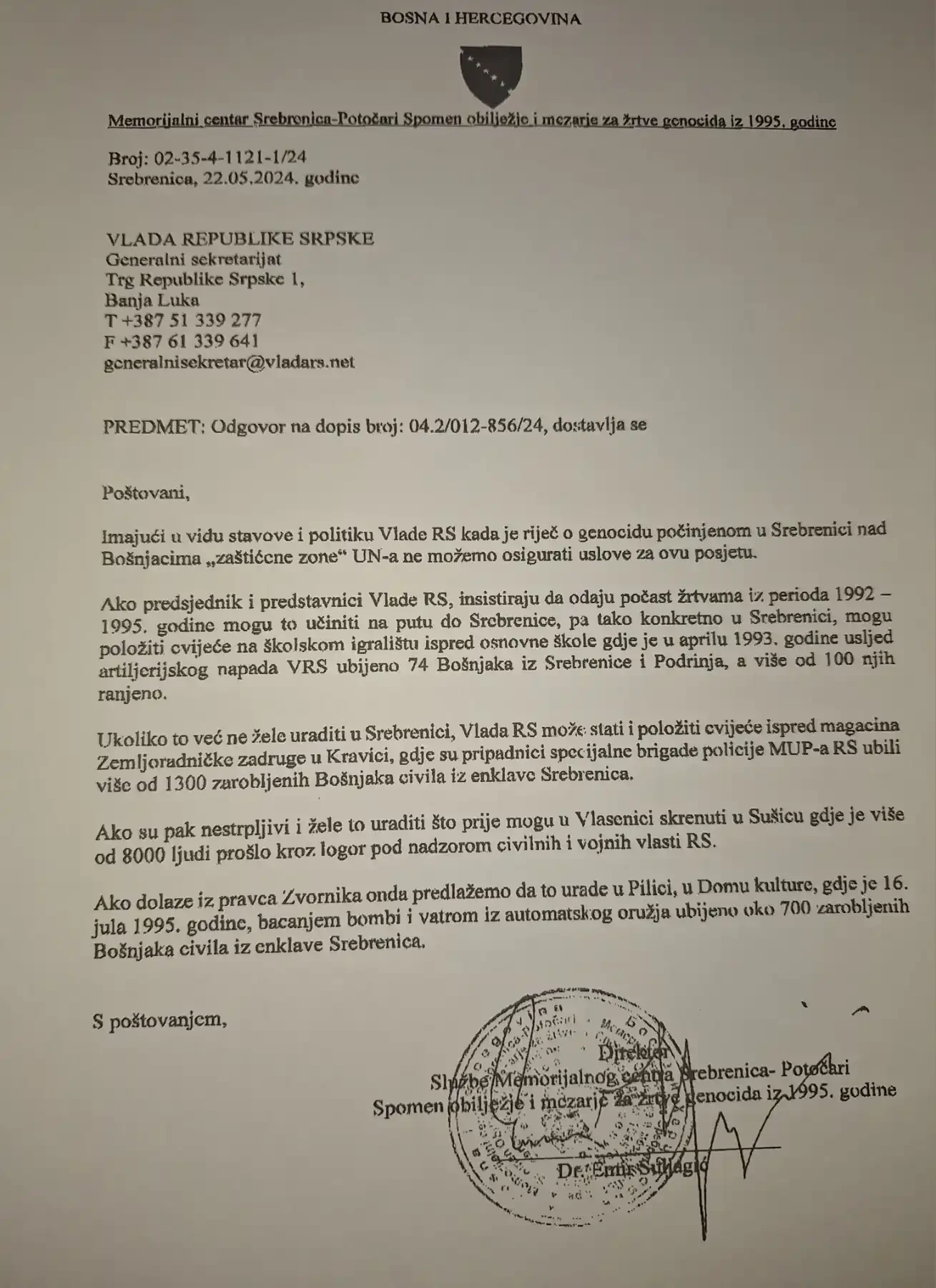 “Imajući u vidu stavove i politiku Vlade RS kada je riječ o genocidu počinjenom u Srebrenici nad Bošnjacima “zaštićene zone” UN-a ne možemo osigurati uslove za ovu posjetu”, saopštili su iz Memorijalnog centra.