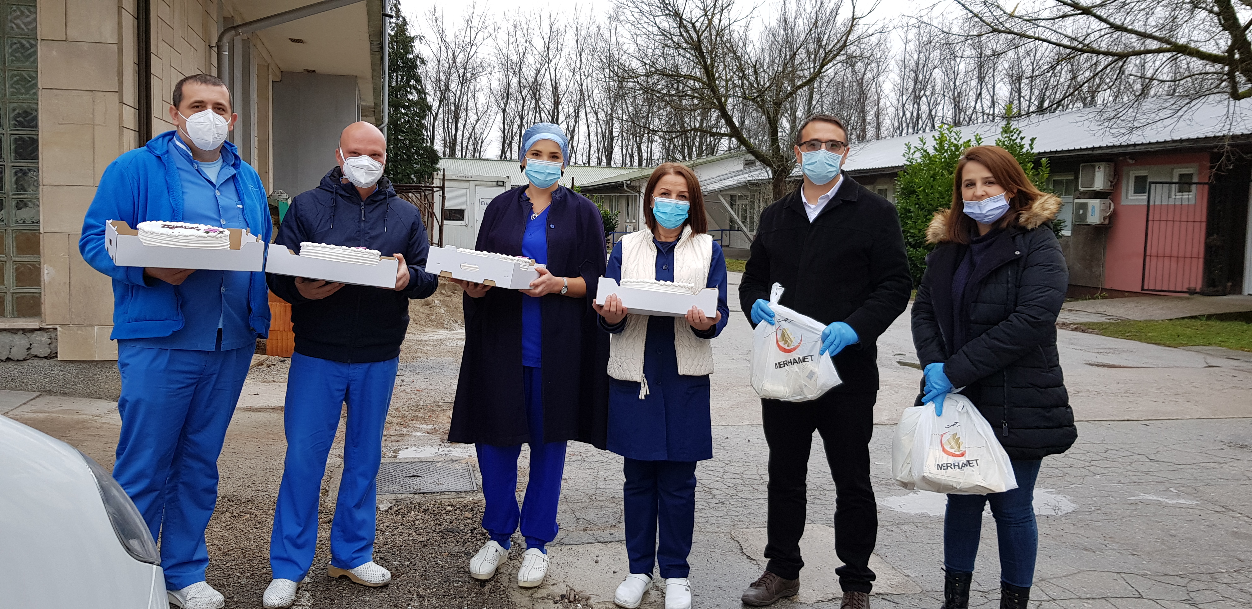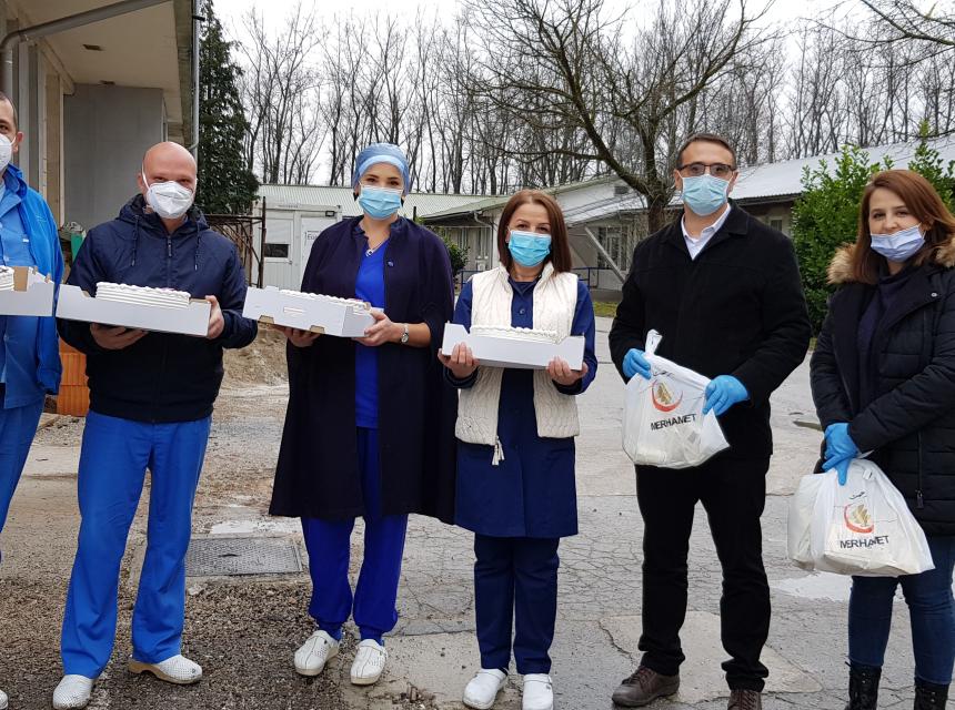 Ljekarima i ostalom medicinskom osoblju, koji se već nekoliko mjeseci hrabro suočavaju sa brojnim izazovima zbog posljedica koronavirusa, “Merhamet” je dostavio voće, torte i kahvu sa simboličnim natpisom “Budimo odgovorni”.