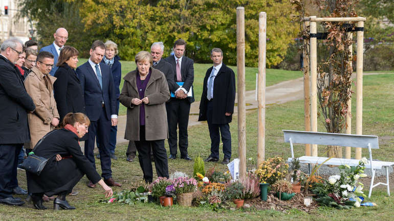 S grupom studenata položila je bijele ruže na spomen-obilježje za deset ubijenih u napadima NSU-a u parku u Zwickauu.