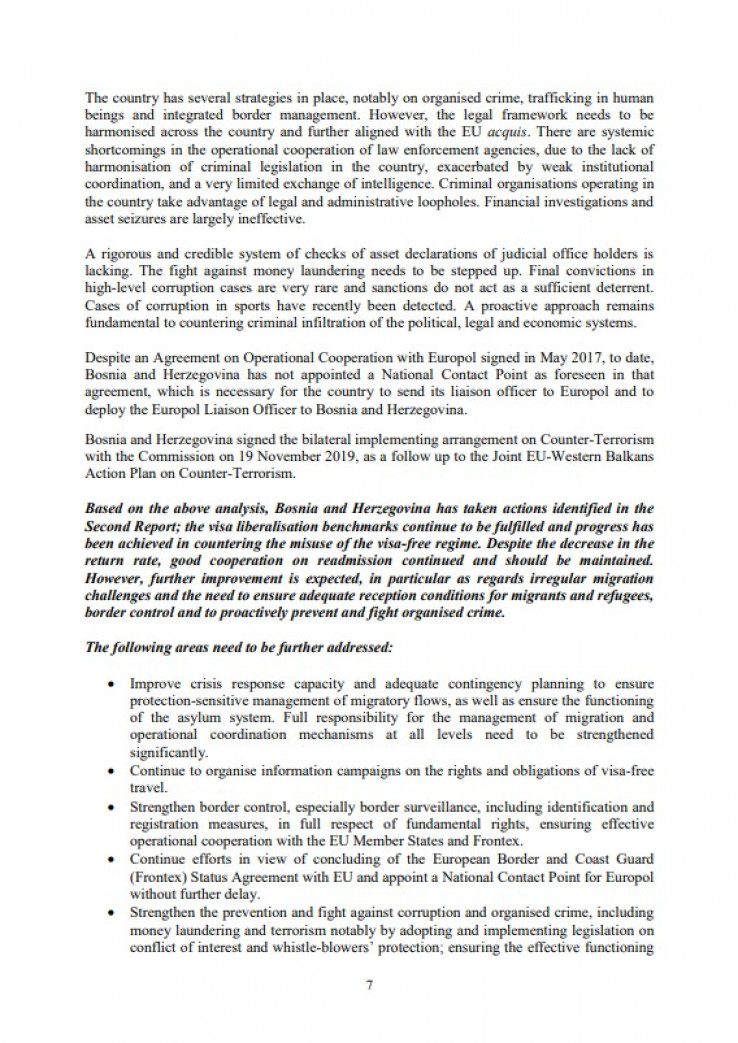 U Izvještaju se u direktnu vezu dovodi zadržavanje bezviznog režima i potreba BiH da poboljša granične kontrole, spriječi zloupotrebe i aktivnije pokrene borbu protiv organiziranog kriminala.