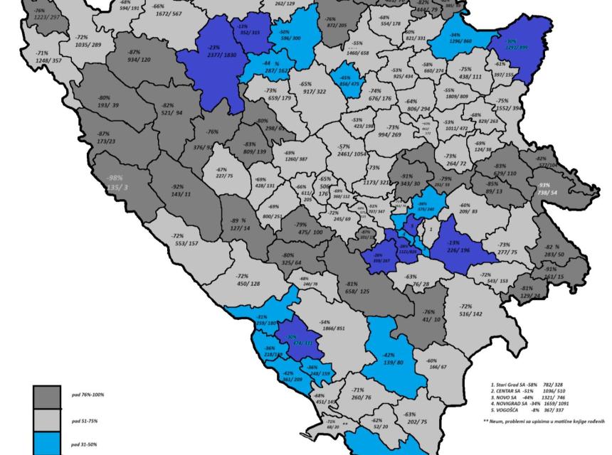 Bosna i Hercegovina je demografski najugroženija država regiona, a razlika u broju rođenih 1990. godine u odnosu na 2022. govori o dramatičnoj situaciji u kojoj se nalazi. Do zabrinjavajućih podataka, po kojima su 1990. godine u našoj zemlji rođene 66.964, a 2022. tek 26.539 beba, došao je pravnik Miodrag Pantović, masterant na Demografskom odsjeku Geografskog fakulteta u Beogradu, koji je uradio i kartu BiH s visokim procentima pada broja rođenih, na kojoj je najveći dio označen sumornom sivom ili tamnosivom bojom. Ovaj podatak praktično znači da je u 2022. rođeno čak 40.425 beba manje nego 1990. godine.