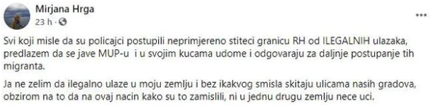 "Svi koji misle da su policajci postupili neprimjereno štiteći granicu RH od ILEGALNIH ulazaka, predlažem da se jave MUP-u i u svojim kućama udome i odgovaraju za daljnje postupanje tih migranta. Ja ne želim da ilegalno ulaze u moju zemlju i bez ikakvog smisla skitaju ulicama naših gradova, s obzirom na to da na ovaj način kako su to zamislili, ni u jednu drugu zemlju neće ući", napisala je Hrga.