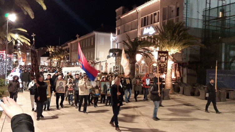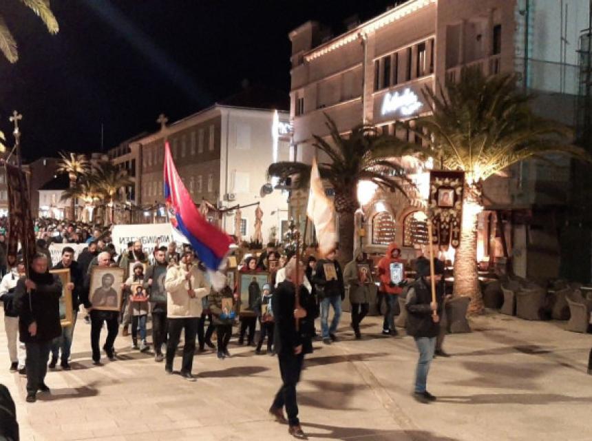 Vjernici nose zastave Srpske patrijaršije, manastira Svetog arhangela Mihaila sa tivatske Prevlake, ikone svetitelja i pjevaju crkvene pjesme. Mirnu šetnju osigurava oko 30 policajaca.