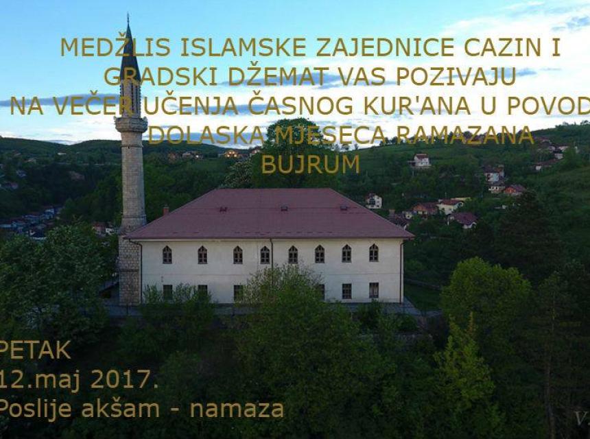 Medžlis Islamske zajednice Cazin (MIZ Cazin) i Gradski džemat Cazin pozivaju sve iskrene vjernike na Večer učenja Časnog Kur'ana.