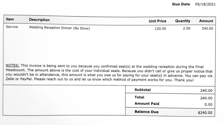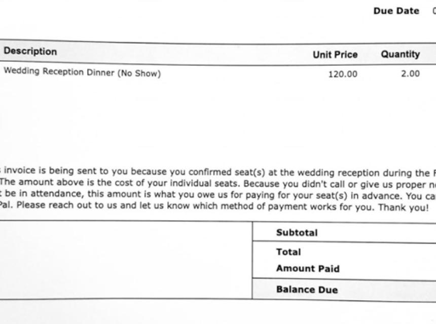 “Ovaj račun vam šaljemo jer ste potvrdili dolazak na vjenčanje, a budući da nas niste obavijestili da ipak nećete doći, ovaj iznos je ono što nam dugujete jer smo unaprijed platili za vaša mjesta. Javite nam koji način plaćanja vam odgovara. Hvala vam”, napisali su supružnici uz račun.