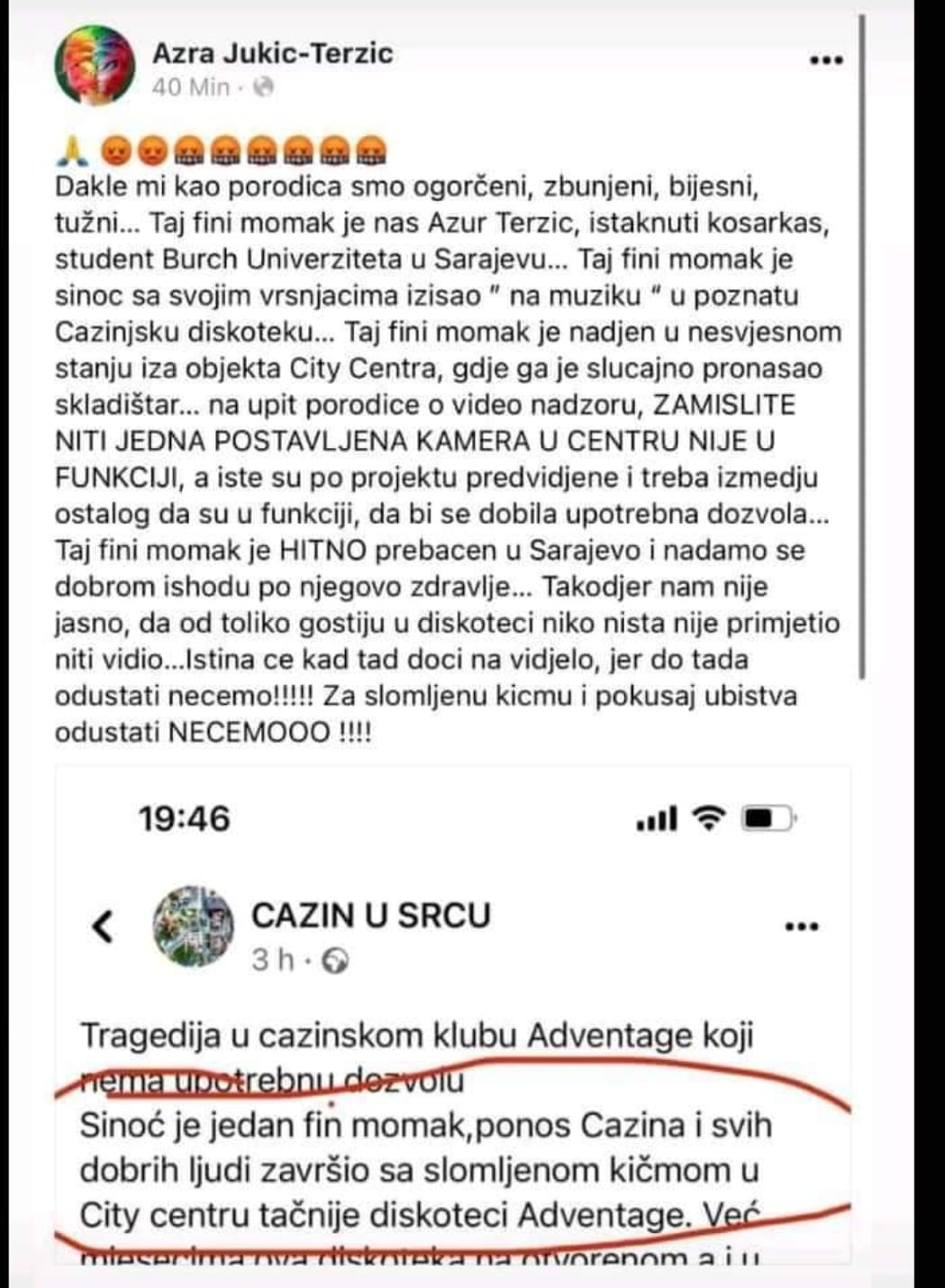 Azur Terzić, mladi košarkaš KK Igman Burch sa Ilidže, teško je povrijeđen pod nerazjašnjenim okolnostima kada je u blizini jedne diskoteke u Cazinu pronađen u nesvjesnom stanju sa slomljenom kičmom.