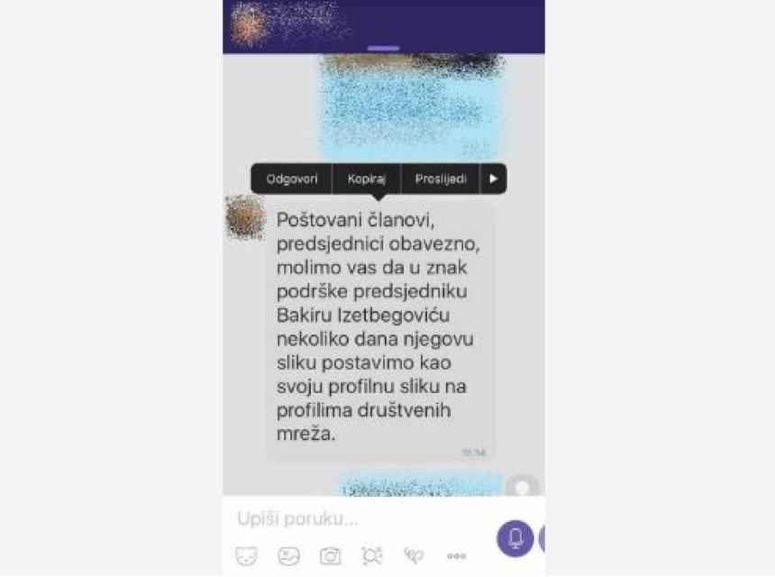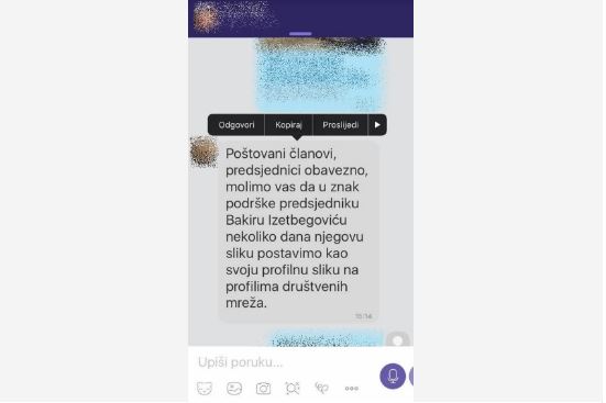 "Poštovani članovi, predsjednici, obavezno, molimo vas da u znak podrške predsjedniku Bakiru Izetbegoviću nekoliko dana njegovu sliku postavimo kao svoju profilnu sliku na profilima društvenih mreža", stoji u poruci koju Asocijacija mladih SDA na čelu sa Salkom Zildžićem šalje mladim članovima SDA.