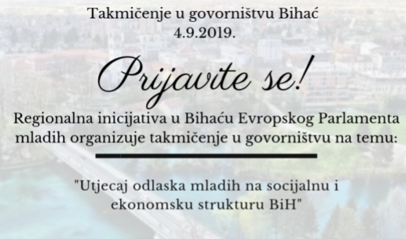 Mladi ljudi su željni dokazivanja, pa je zato bihaćka regionalna podružnica Evropskog parlamenta mladih BiH, organizovala takmičenje u govorništvu čija je tema „Utjecaj mladih na socijalnu i ekonomsku strukturu BiH“. Takmičenje će biti održano 4.septembra s početkom u 10 sati u Kulturnom centru, a prijave za sve zainteresovane srednjoškolce su u toku. Cilj ovog takmičenja, jeste argumetirana rasprava, komunikacija lišena svakodnevnih floskula, ali i savladavanje treme u javnim nastupima. Srednjoškolci su dobili podršku bihaće Gradske uprave, te Instituta za mlade KULT.