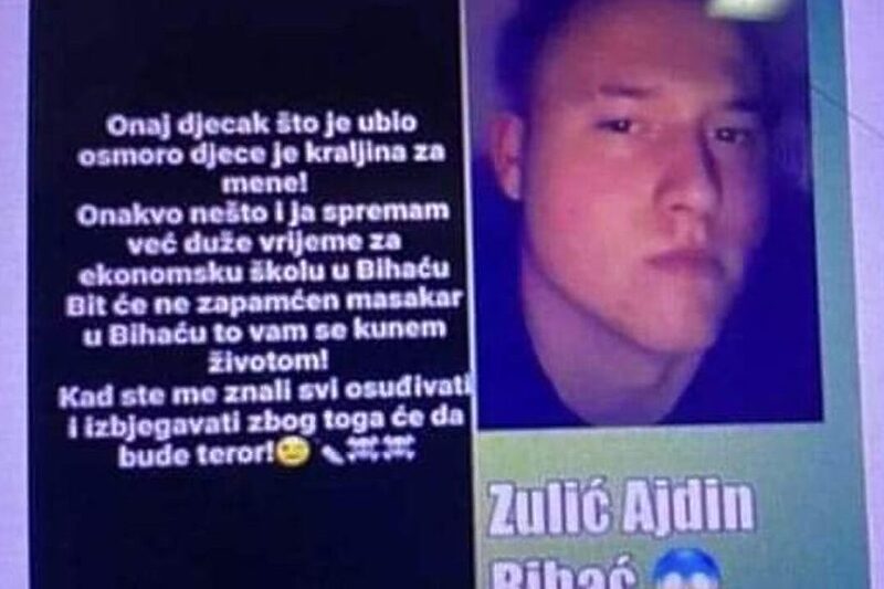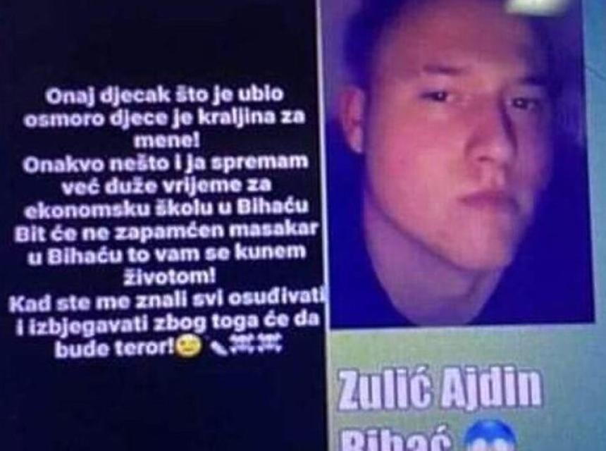 "Onaj dječak što je ubio osmero djece je kraljina za mene! Onakvo nešto i ja spremam već duže vrijeme za ekonomsku školu u Bihaću. Bit će nezapamćen masakr u Bihaću, to vam se kunem životom! Kad ste me znali svi osuđivati i izbjegavati, zbog toga će da bude terror", napisao je Zulić, a objava se širi društvenim mrežama.