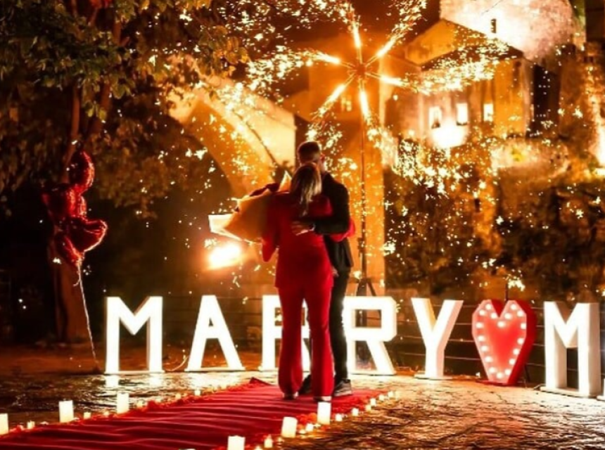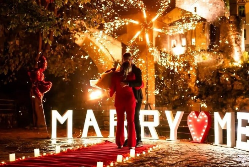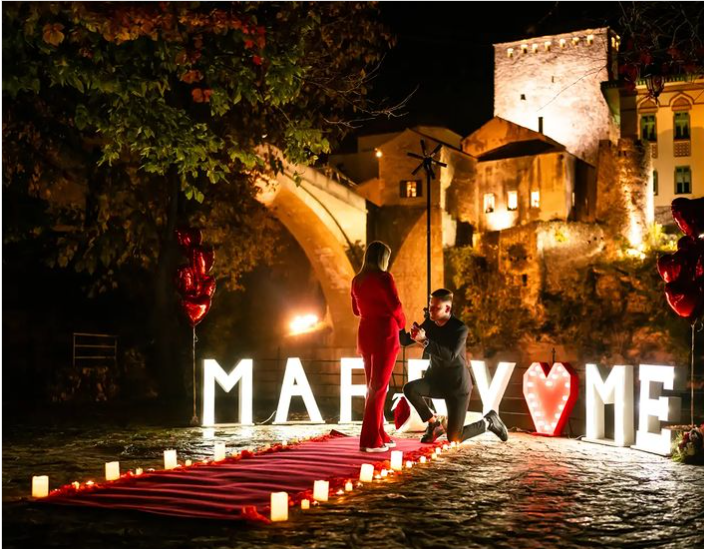 Mladić se naročito potrudio pa je postavio crveni tepih, svijeće, balone te natpis "Marry me" ("Udaj se za mene"). Djevojka je pristala da se uda za njega, a on joj je dao buket ruža.